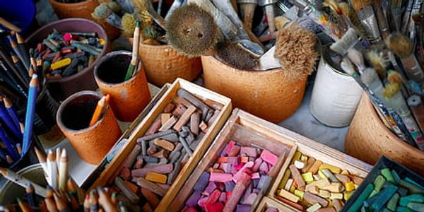We use a variety of different art media including paints, watercolors, oil pastels, graphite pencils, and more. Most of these media are made from some combination of water, oils, waxes, colorants, etc. Canvases, papers, boards, brushes and other materials & tools are also used as a means to create our art.