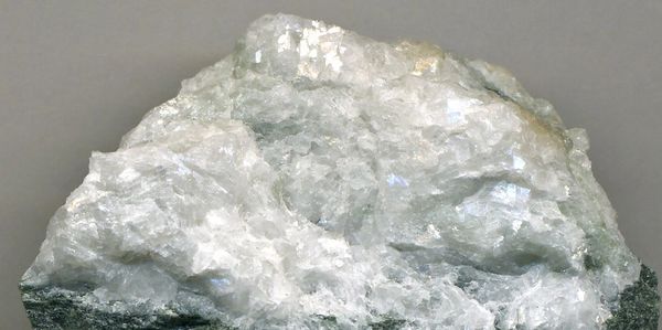 Magnesite is a carbonate mineral and member of the calcite group. It can be formed by several different processes, tends to grow in large fibrous structures, and is white or gray in color. Magnesite is named after magnesium which is abundant within the stone. It is believed to provide a soothing effect, balance emotions, and stimulate imagination.